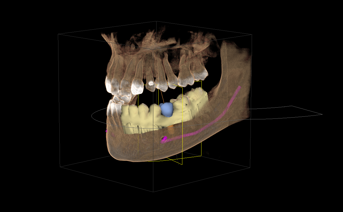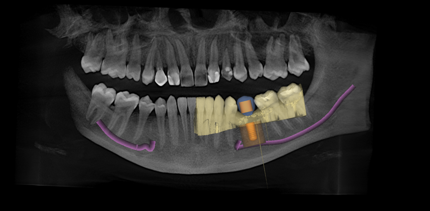 Es erfolgt nun am Computer das Zusammenfügen der mittels optischen Abdrucks erfassten Situation im Mund und des dreidimensionalen Röntgenbildes (DVT). Dies ermöglicht eine genaue Festlegung und Planung der Implantatposition am Bildschirm. Es ist somit möglich, sowohl die knöcherne Situation, als auch die klinischen Situation im Mund kombiniert darzustellen. Umliegende anatomische Strukturen, wie Nervenverläufe oder Kieferhöhlen können somit ebenso berücksichtigt werden, wie die Schleimhautdicke oder die Position der Nachbarzähne. Die geplante Krone wird im nun kombinierten Bild ebenfalls dargestellt und ermöglicht eine exakt auf sie abgestimmte Implantatposition.