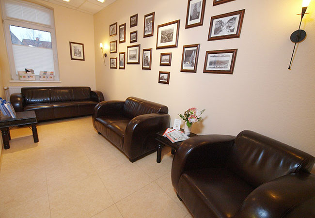 Sollte sich Ihre Behandlung, beispielsweise durch einen Notfall, doch einmal verzögern, möchten wir Ihnen die Wartezeit so angenehm wie möglich gestalten. Nehmen Sie im Warteraum in einem unserer bequemen Ledersessel oder auf einem unserer Ledersofas Platz.
